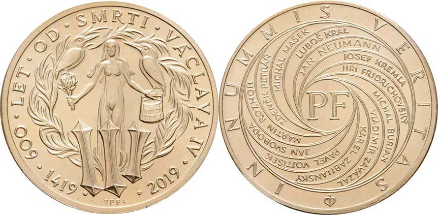 PF 2019 - 600 let úmrtí Václava IV. - "W", lazebnice, ledňáčci a opis / v paprscích jména vydavatelů, velké "PF" a opis, Sign., mosaz 30mm, 13.452g