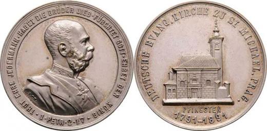 Christlbauer - návštěva císaře u sv.Michala 1891 - poprsí zprava, německý opis / kostel s věží, německý opis a nápis, postříbřený bronz 36 mm, ŠFP.80c