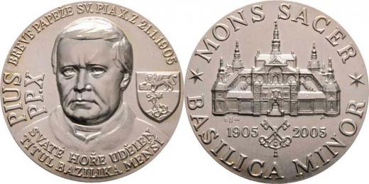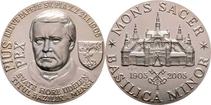 100 let povýšení Svaté Hory na basilicu minor 2005 - papež Pius X. čelně, znak, písmo/ chrám, písmo, Sign. JČ (Čáka), Ag925, 50mm, 76.596g, čísl.59/70, etue RR!