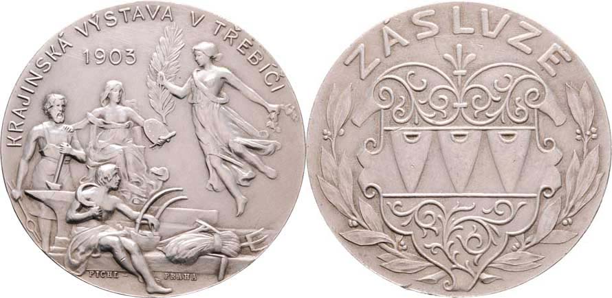 Pichl - Krajinská výstava 1903 - Zásluze - městský znak ve vavřínovém věnci, nápis / alegorie, vročení a opis, Sign., Punc., Ag 45mm, 34.038g, vlas.rysky