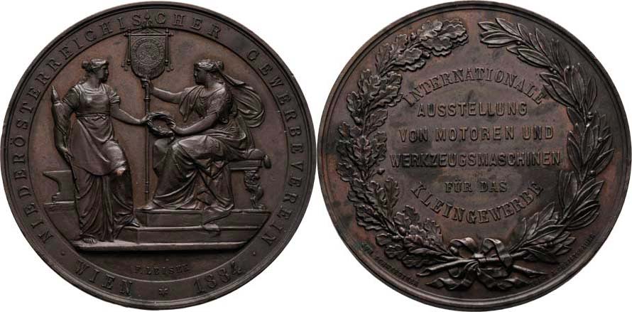 Leisek - Mezinárodní výstava motorů a dopravních strojů 1884 - alegorie a opis / 6-řádkový nápis ve věnci, Sign., měď 60mm, 84.326g, dr.hr.,dr.rys., tém.