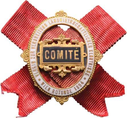 Rotunda - výbor výstavy Hospodářského spolku 1894, Sign.Schwerdtner, honosný zlacený a smaltovaný bronz. odznak, 40x47 mm, dvě stužky, původní etue R!