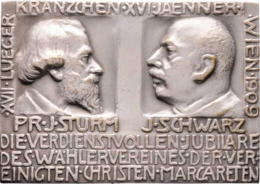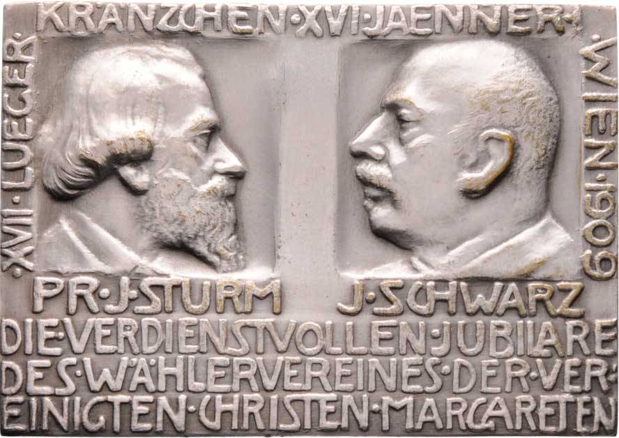 Vídeňský spolek křesťanských voličů 1909 - svým zasloužilým jubilantům - dva portréty, nápisy, Sign. Reinemer & Spiegel, patin. stříbř. bronz 65x47 mm