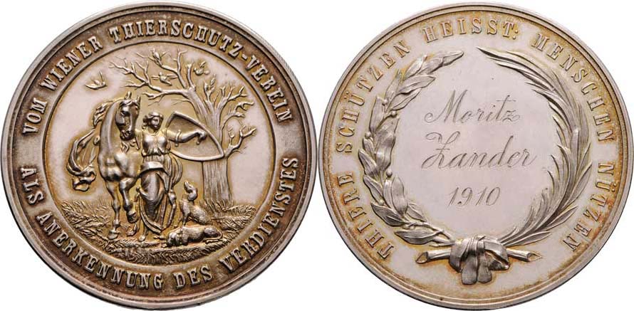 Vídeňský spolek pro ochranu zvířat b.l.(uděleno 1910) - alegorie, opis/ opis, věnec, ryté udělení, Nesign., Punc., Ag800, 46mm, 37.717g, nep.rysky, pěkná patina