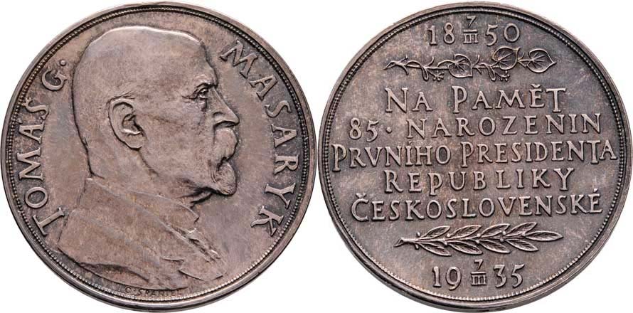 Španiel - na 85.narozeniny 1935 - poprsí zprava, opis / 7-řádkový nápis, ratolesti, Sign., lesklé Ag, 32mm, 14.868g, Fl.41d, Nov1.100a, patina, původ.etue