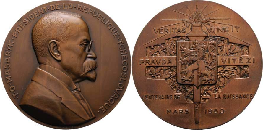 Bazor, Paříž - AE na 85.narozeniny 1950 - poprsí zprava, opis/znak ČSR, pochodeň, vavřín.listy, nápis, 68mm, 144.840g, Fl.75, Nov1.182b, původní ražba RRR!