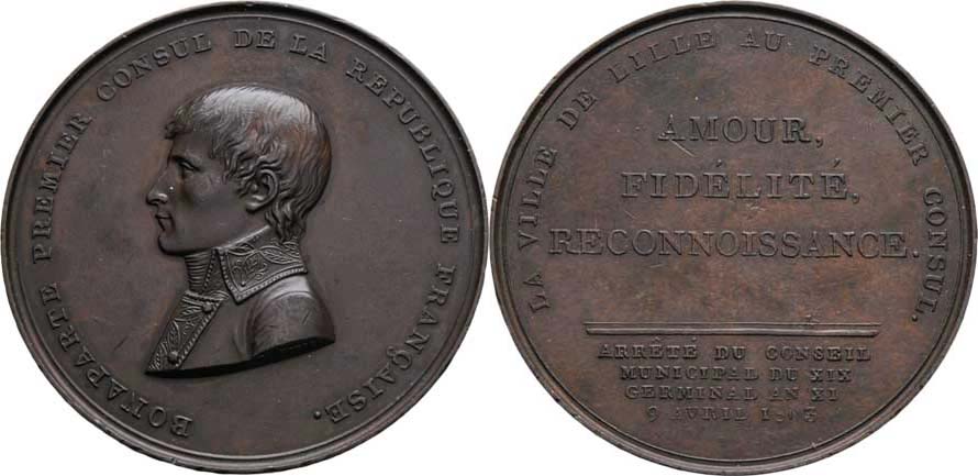 Auguste - AE medaile na holdování města Lille 1803 - poprsí zleva, opis / 7-řádkový nápis a opis, Sign., 50mm, 64.752g, Bramsen.263, dr.hr., dr.rysky, pat. R!