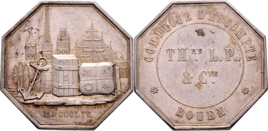 Rouen 1854 - obchodní a průmyslová komora - balíky zboží a sudy v přístavu, vročení/ 2-řádk.nápis, opis, Sign.Hamel A., Punc.ARGENT, 36x36 mm, 18.816g, rysky