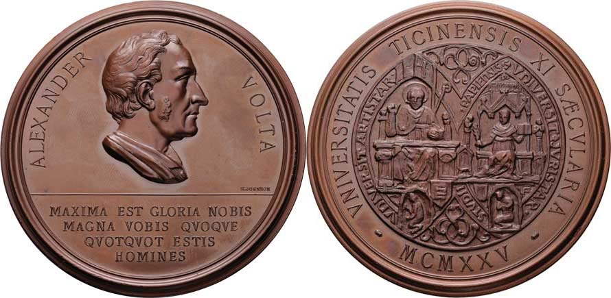 Pavia 1925 - prof. Alexander Volta, opis a nápis / pečeť university, opis, vročení, Sign.Johnson, patinovaný bronz 68mm, 154.378g, krásná patina R!