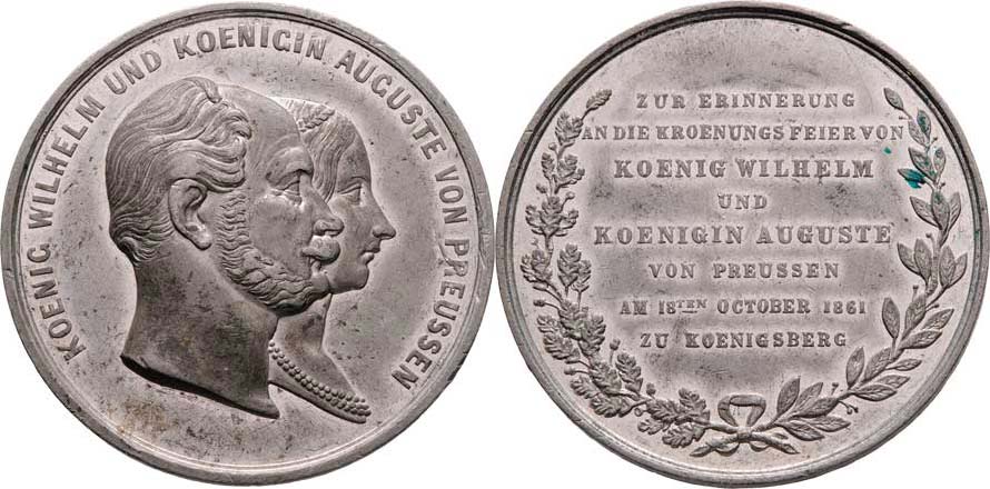 Wilhelm I. a Augusta - medaile na korunovaci 1861 - dvojportrét zprava, opis / 8-řádkový nápis ve věnci, Nesign., cín 45 mm, 20.062g, dr.hr., dr.škr., patina