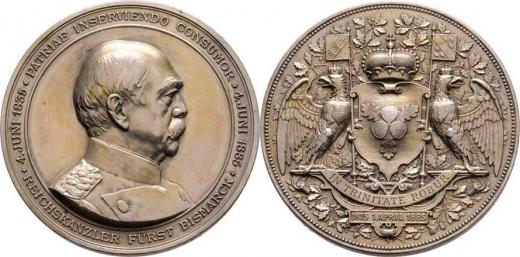 Otto von Bismarck - 70 let narození 1.4.1885 - poprsí zprava, opis/ znak nesený říšskými orlicemi, vročení, Sign.Schwenzer, Nepunc., Ag 38mm, 26.136g, vl.rysky