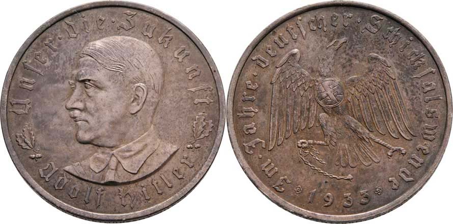 Nesign. - Adolf Hitler - převzetí vlády 1933 - poprsí zleva, dubové snítky, opis/ říšská orlice trhá řetězy, opis, Ag900, 36mm, 21.804g, dr.rysky, patina