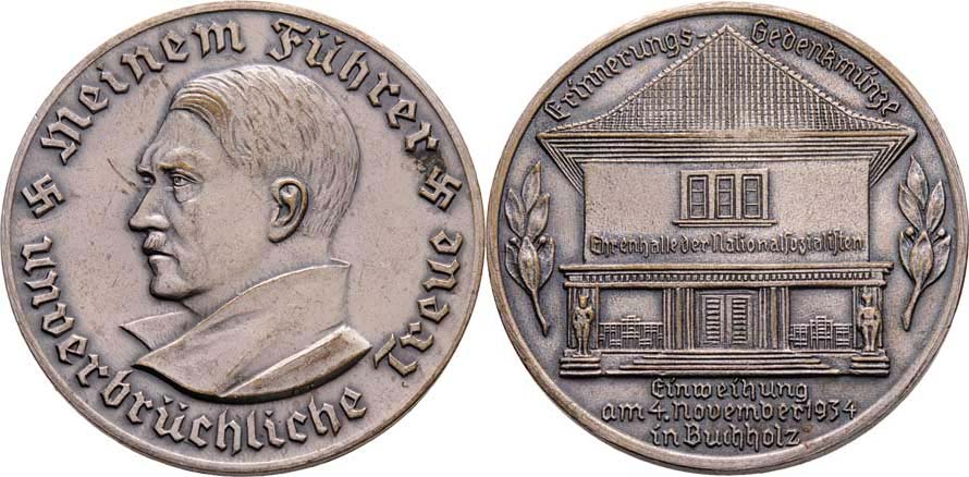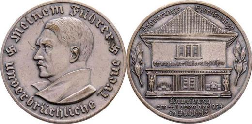 Nesign. - otevření Národního domu v Buchholtzu 1934 - poprsí A.Hitlera zleva, opis / průčelí domu, opis a nápis, patinovaný postříbřený bronz 35 mm
