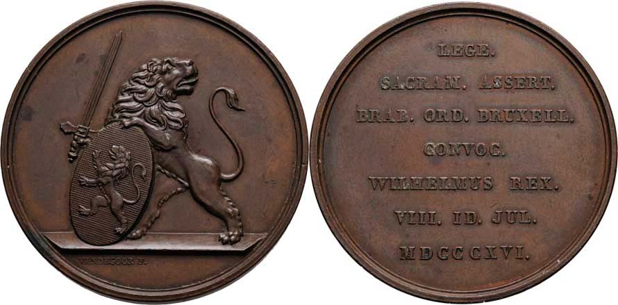 Wilhelm I. - medaile na svolání parlamentu 8.7.1816 - lev s mečem a štítem / 7-řádk.nápis, Sign.Vandegoor, měď 46mm, 44.822g, nep.hr., nep.rysky, pěkná patina