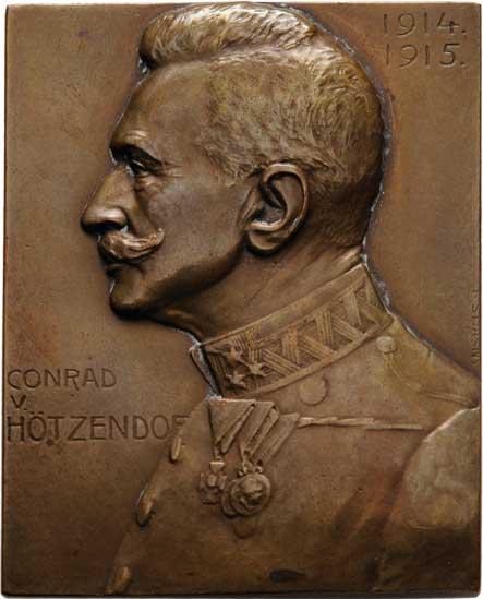 Stiasny - Conrad von Hötzendorf 1914 / 1915 - poprsí zleva, 2-řádk.nápis, Sign., jednostr.bronz 51x65 mm, pěkná patina, téměř