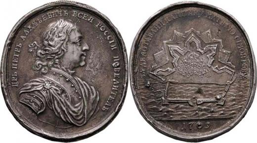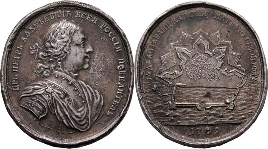 Petr I. Veliký - cínová medaile na návštěvu expedice kapitána Metveja Simonoviče v Havaně 1709, Sign.XL, cín 37/42 mm, vady razidla, hrany, úhozy, patina RR!