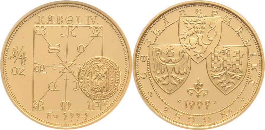 2500 Koruna 1999 - Karel IV. - listina a pečeť, KM.39 (Au999, 7.77g, pouze 1500 ks), kapsle