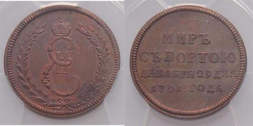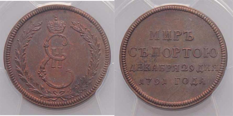 Kateřina II. - jeton na mír s Tureckem 29.12.1791 - korunovaný monogram ve věnci / 4-řádkový nápis, novoděl, Diakov.225.9, zataveno v etui PCGS R!