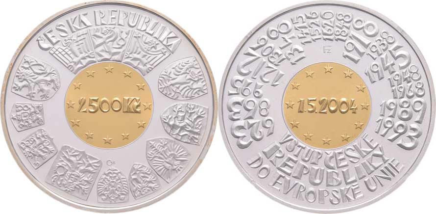 2500 Koruna 2004 - vstup do EU (bimetal 7.78g Au + 31.10g Ag, pouze 10.000 ks), kapsle, etue, karta
