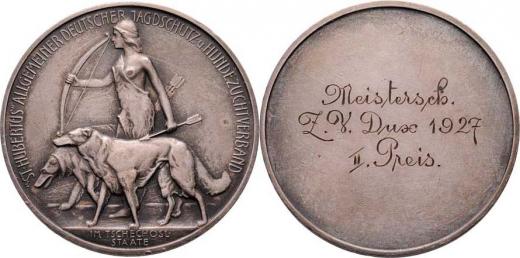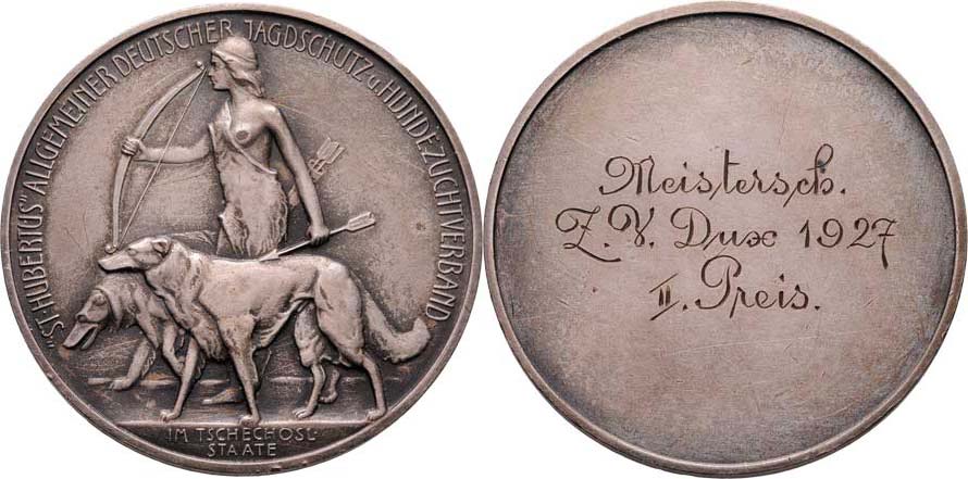 Dux (Duchcov) 1927 - německý myslivecký a kynologický spolek - II.cena střelecké soutěže - Diana se psy, opis / rytý nápis, Nesign., patin. postř. bronz 44 mm