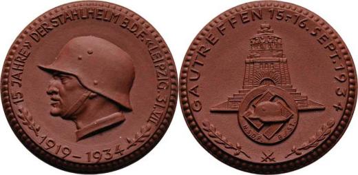 Lipsko 1935 - setkání na 15 let spolku Stahlhelm - voják v přilbě zleva, opis / památník u Lipska, znak, opis, míšeňský hnědý porcelán 37 mm