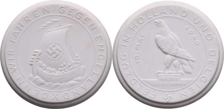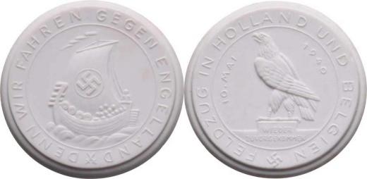 Německo - 10.5.1940 - tažení proti Belgii, Nizozemí a Anglii - sedící orel, nápis, opisy / vikingská loď, opis, značený míšeňský bílý porcelán 48 mm