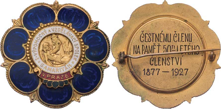 Praha 1927 - I.výpomocný a vzděláv. spolek Samaritán - honosný odznak čestného člena, Nesign., smaltovaný zlacený bronz 52 mm se zavíracím špendlíkem RR!