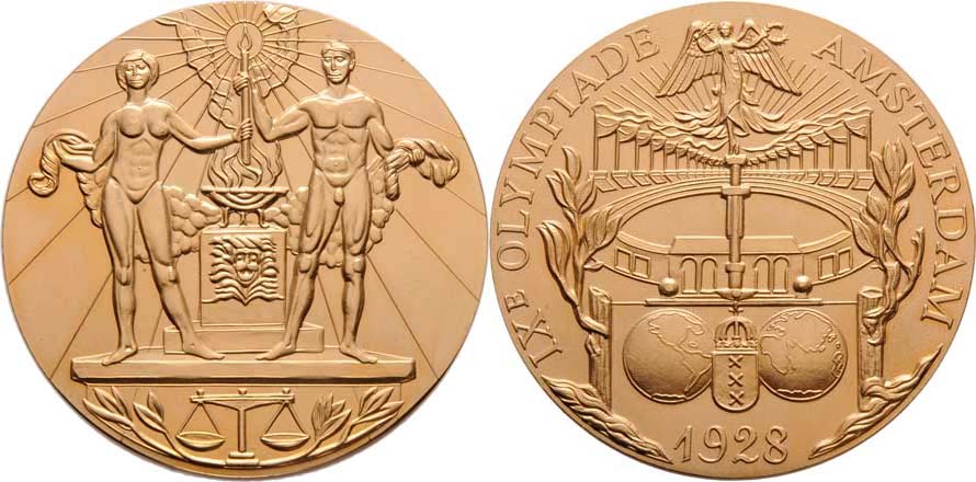 Amsterdam 1928 (pozdější) - IX.letní olympijské hry - alegorie / Niké nad stadionem, mapy, písmo, Nesign., zlacený bronz 50 mm