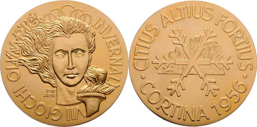 Cortina 1956 (pozdější) - VII.zimní olympijské hry - alegorie, opis / hory, vločka, opis, Sign., zlacený bronz 50 mm
