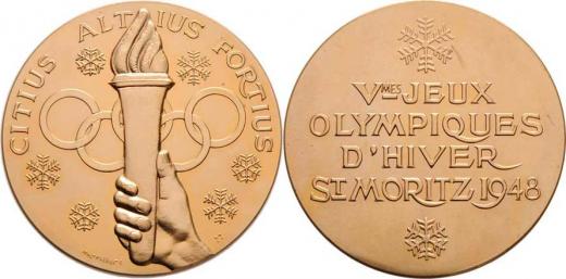 St.Moritz 1948 (pozdější) - V.zimní olympijské hry - ruka s pochodní, olymp.kruhy, vločky, opis / vločky a nápis, nečitelná signatura, zlacený bronz 50 mm