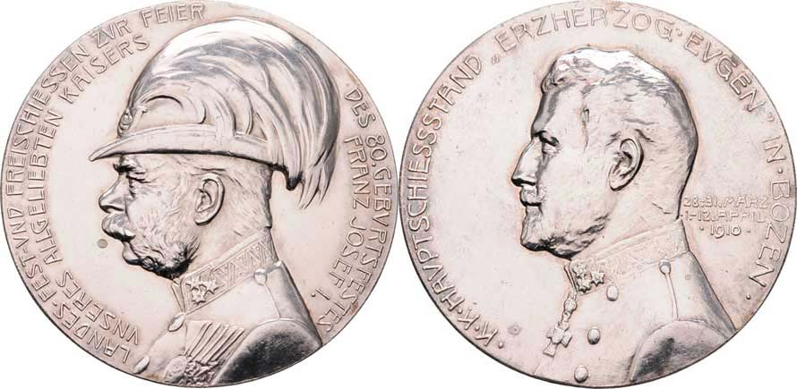 Bozen (Bolzano) 1910 - jubilejní císařské střelby, císař zleva, opisy / arcivév. Eugen, písmo, Nesign., Punc., Ag 45mm, 40.203g, nep.hr., vlas.rysky R!
