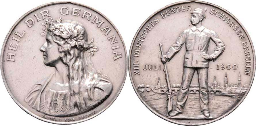 Dresden (Drážďany) 1900 - 13.německé spolkové střelby - Germanie zleva, opis / střelec s puškou, město, vročení, opis, Sign.Kramer, 38mm, 27.288g, oprav.hr.