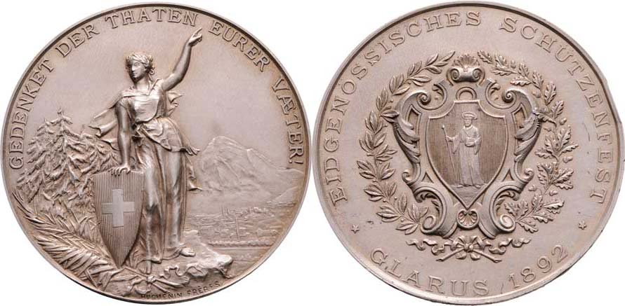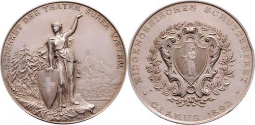 Glarus 1892 - stojící Helvetia, krajina, opis / městský znak ve věnci, opis, Sign.Huguenin, Nepunc., patinované Ag, 45mm, 38.679g, hr., vlas.rysky, téměř
