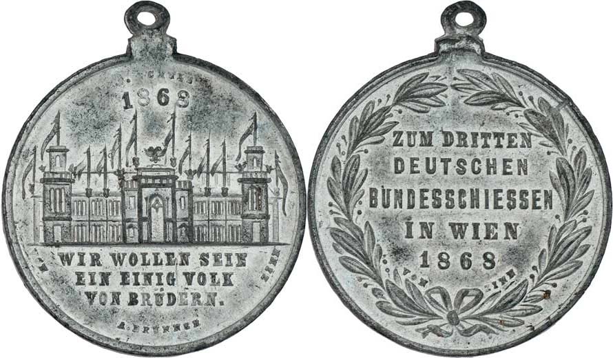 Vídeň 1868 - III.německé spolk. střelby - střelnice, nápis/ 5-řádkový nápis ve věnci, Sign.Brunner, cín 33 mm s pův. raženým ouškem, Haus.5039, úhoz, patina