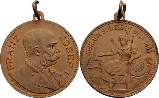 Vídeň 1898 - jubilejní střelby - Fr.Josef I. zprava, opis / sedící žena s terčem a puškou, město, opis, Sign.Pittner, mosaz 29 mm s původním raženým ouškem