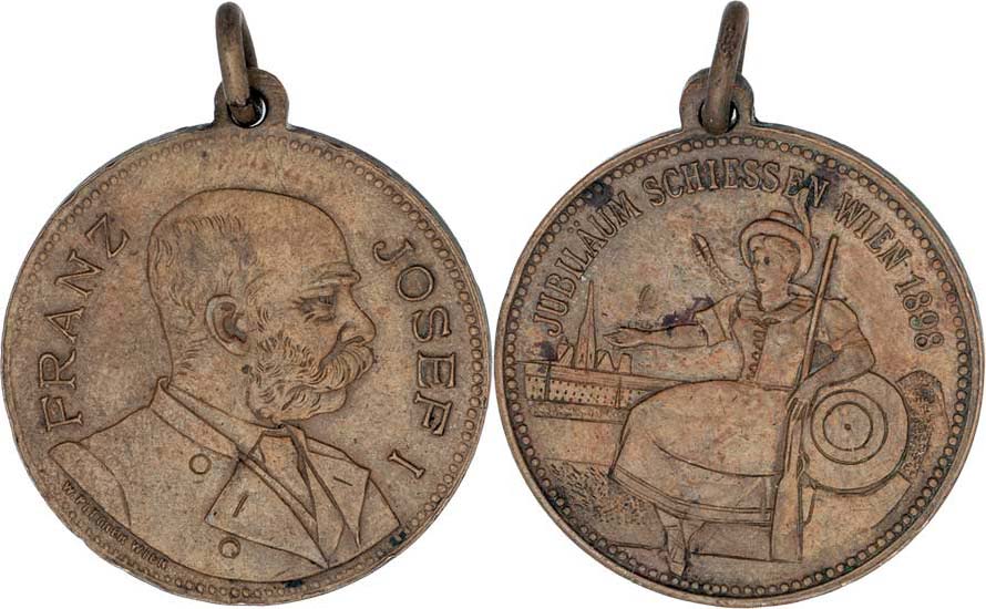 Vídeň 1898 - jubilejní střelby - Fr.Josef I. zprava, opis / žena s terčem a puškou, město, opis, Sign. Pittner, mosaz 29mm s původním ouškem, dr.hr., škr.