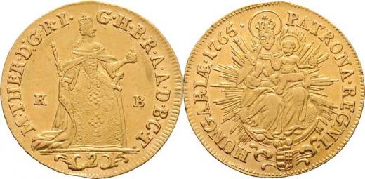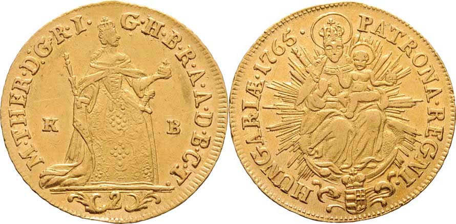 2 Dukát 1765 KB, Kremnica - bez značky mincmistra, N.70, Husz.1648, KM.379 (pouze 26.000 ks), 6.941g, dr.hr., nep.rysky, pěkná patina R!