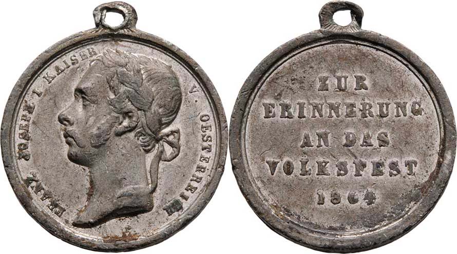 Sign.P - upomínka na lidovou slavnost (v Prátru) 1864 -hlava zleva, německý opis / 5-řádkový německý nápis, cín 23 mm s původním raženým ouškem, rysky, skvr. R!