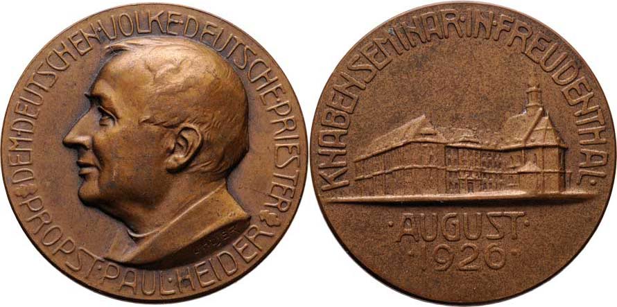 Seminář ve Freudenthalu (Bohosudově) - srpen 1926 - poprsí probošta Paula Heidera zleva, opis / budova semináře, opis a nápis, Sign., patinov. bronz 35 mm