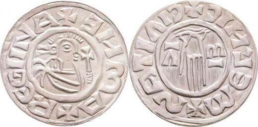 Mělník - replika denáru kněžny Emmy 1971 - Boží ruka mezi písmeny alfa a omega, opis/ poprsí ethelredského typu, opis, Sign., Nepunc., Ag 27mm, 7.158g, k.105
