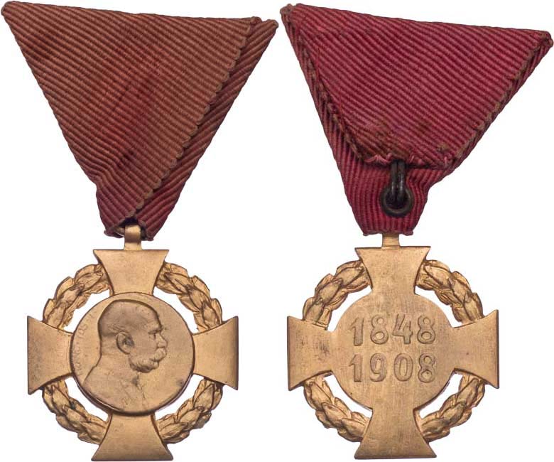 Jubilejní kříž 1908 - pro civilní osoby, Marko.403a, VM.37b, původní červená trojúhelníková stuha