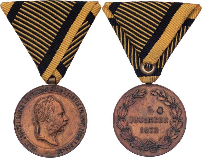 Válečná pamětní medaile 2.DEC.1873, Marko.364a, VM1.28a, Sign., číslice 2 dole rovná, hr., dr.rysky, dr.vada razidla v reversu, nepůvodní stuha