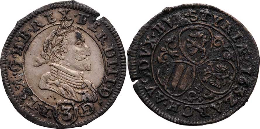 3 Krejcar 1632, Štýrský Hradec, M-A.129, 1.646g, dr.vada materiálu na hraně, skvrny, patina