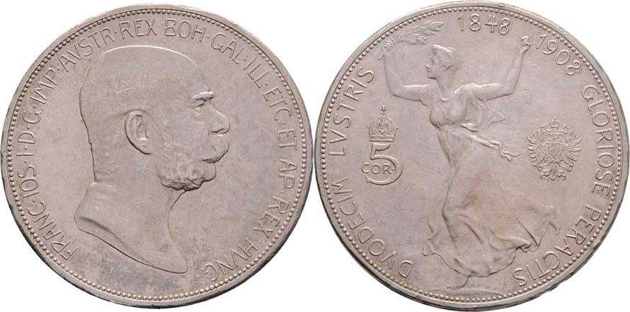 5 Koruna 1908 - jubilejní, 23.975g, nep.hr., nep.škr., vlas.rysky, pěkná patina