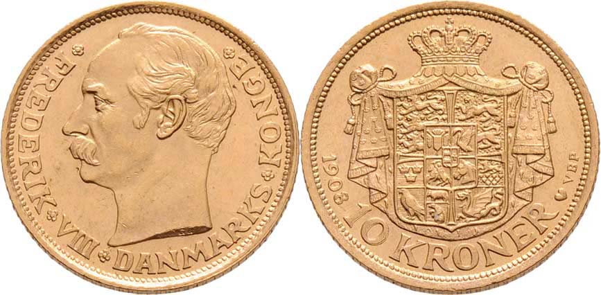 10 Koruna 1908 VBP, Kodaň, KM.809 (Au900), 4.479g, nep.hr., nep.rysky, krásná patina