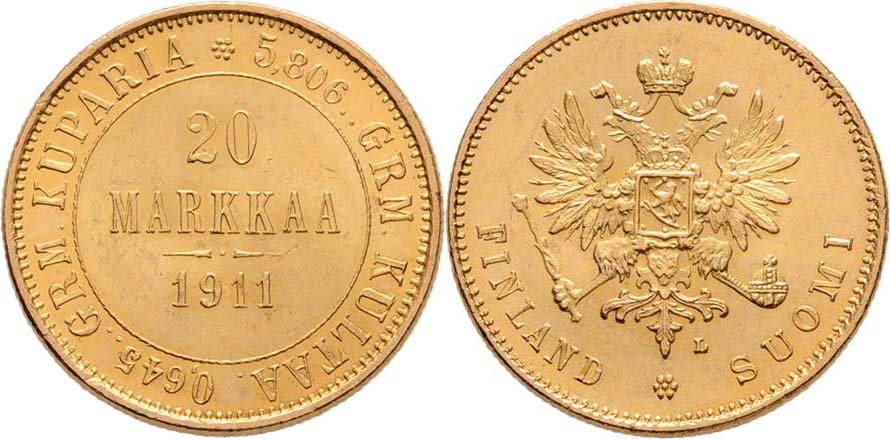 20 Marka 1911 L, Helsinki, KM.9.2 (Au900), 6.449g, nep.hr., nep.rysky, pěkná patina, téměř