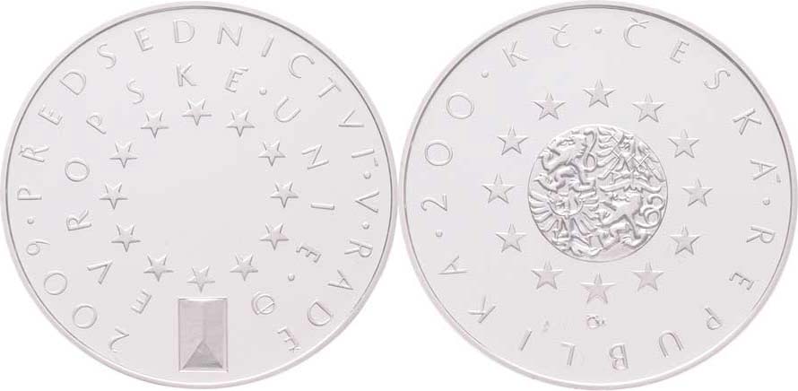 200 Kč 2009 - Předsednictví ČR v Radě EU, KM.105 (Ag900, 13.0g, 19.700ks), kapsle, etue, karta