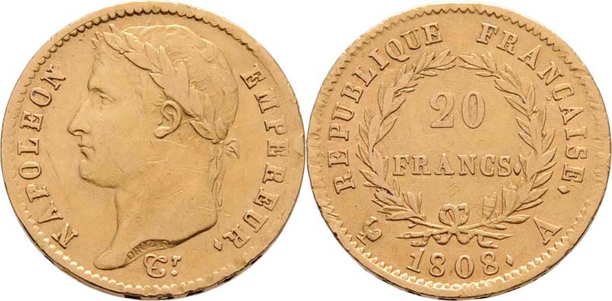 20 Frank 1808 A, Paříž, KM.687.1 (Au900), 6.409g, dr.hr.ražbou, dr.rysky