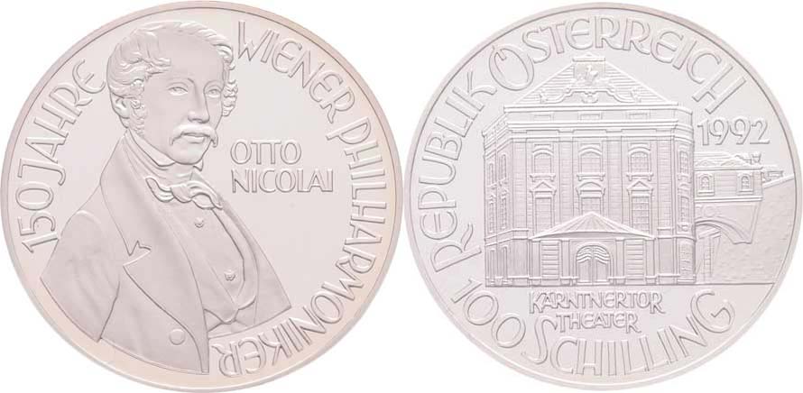 100 Šilink 1992 - Otto Nicolai / Kärntentortheater, KM.3005 (Ag900, 20.00g, 75.000 ks), kapsle, etue, certifikát