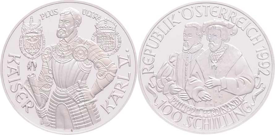100 Šilink 1992 - císař Karel V. Habsburský, KM.3007 (Ag900, 20.00g, 75.000 ks), kapsle, etue, certifikát